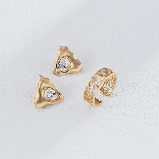 Clean lines meet quiet emotion in this triangular design, where a sense of reason is softened by a silk-like brushed texture. A subtle sparkle catches the light, not to impress, but to echo confidence from within. Poised between strength and tenderness, this piece reflects the modern woman—independent, composed, and effortlessly refined.
